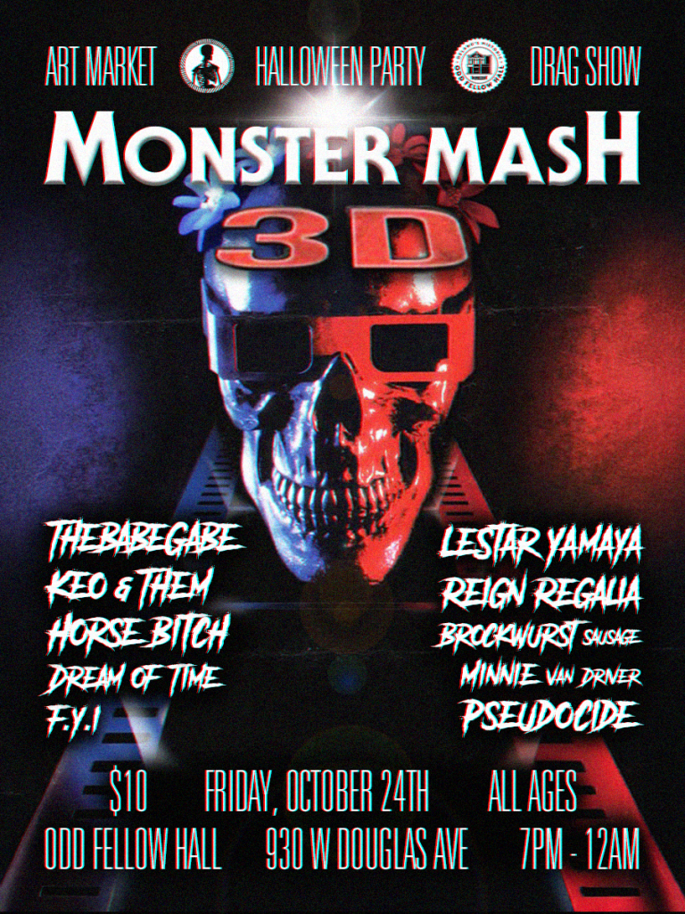 Odd Fellow Hall 930 W Douglas Ave Suite I, Wichita, KSStep into 3 dimensions of Halloween celebration at Monster Mash 3D, coming to Odd Fellow Hall on Friday, October 24, 2025, from 7pm to Midnight. Live music from KC pop-rap artist TheBabeGabe (formerly of Blackstarkids), Wichita’s own Keo & Them (R&B/Soul) and FYI (Rap), plus Colorado acts Horse Bitch (Emo Rock) and Dream of Time […]