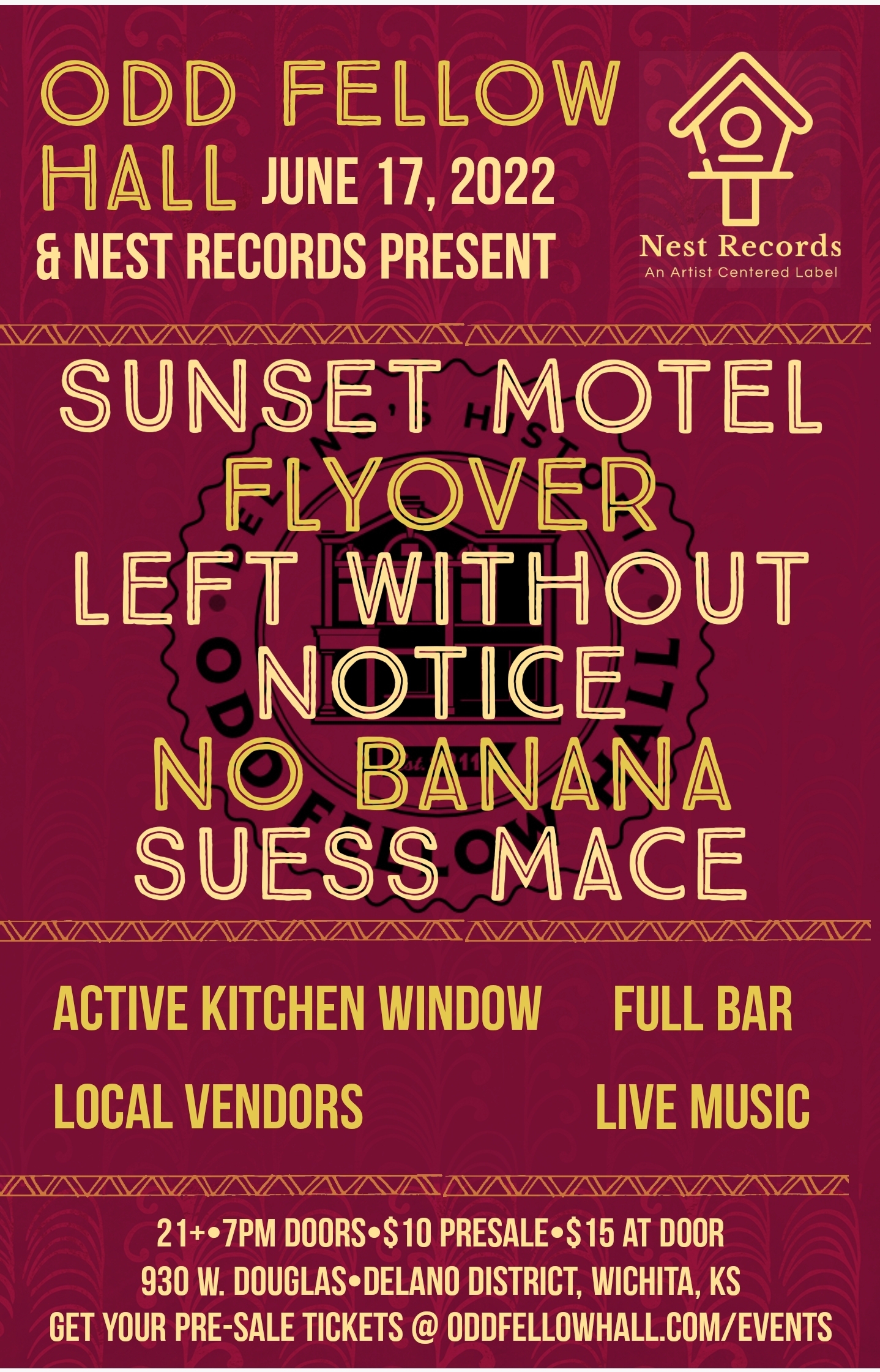 Wichita's Nest Records and Odd Fellow Hall are linking up to bring you a great show 6/17/2022! Doors open at 7 21+/$10 Presale/$15 Day of Show at the door. Food Window open and curated by the chef's at Odd Fellow Hall, Full bar with specialty cocktails. No Banana 8PM Flyover 9PM Left Without Notice 10PM […]