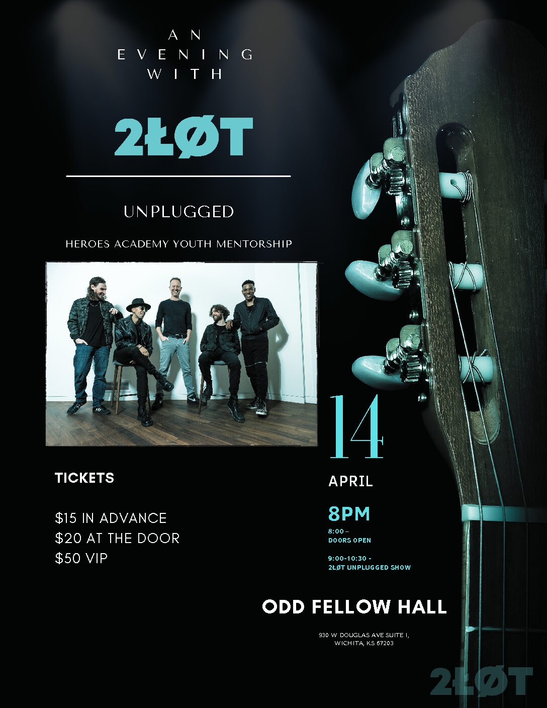 $15 Pre-Sale Ticket (Available until 11:59PM 4/13) - $20 Day of Show Ticket - $50 VIP Ticket We want to personally invite you to our show 2ŁØT “Unplugged” on April 14th at Odd Fellow Hall. This show is really special to us. It will be in support of Heroes Academy (Youth Mentorship Program) and we […]